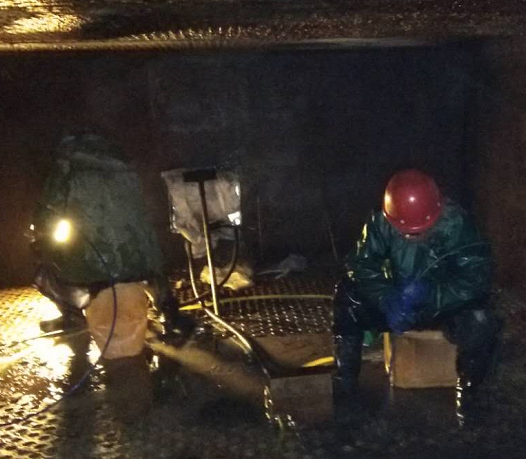 因2#鍋爐上下級空預(yù)器堵塞嚴(yán)重,無法滿足生產(chǎn)負(fù)荷要求,影響鍋爐正常運(yùn)行,2019年1月14日9點(diǎn)30分,根據(jù)公司停車檢修計(jì)劃,對2#鍋爐空預(yù)器管進(jìn)行清洗及疏通,首先在煙道底部制作排水口,引至地溝,保證現(xiàn)場路面無積水及結(jié)冰,待空預(yù)器內(nèi)溫度下降,公司領(lǐng)導(dǎo)組織崗位人員輪流進(jìn)入空預(yù)器清理積灰,為空預(yù)器管道清洗及疏通做好各項(xiàng)準(zhǔn)備工作,15日正式使用清洗機(jī)對空預(yù)器進(jìn)行帶壓清洗,所有人員不怕苦、不怕累、放棄休息時間協(xié)助外包人員及時疏通空預(yù)器堵塞管道,更換空預(yù)器套管,檢修人員雖然穿著厚厚的棉衣,但不一會也被寒冷打透。手凍僵了,他們搓了搓接著干。