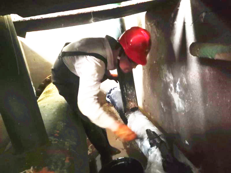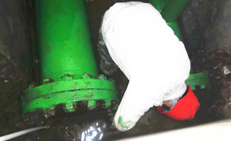 原鹵管線是采鹵崗位重要的組成部分,是停車必檢項之一。但是檢修難度不小,一是過道空間狹小,光線昏暗,一次僅夠兩個人同時作業(yè);二是檢修原鹵管線時,必須“涉水”作業(yè)。檢修期間原鹵管線一閃一閃的焊光將周圍照亮,順著火花向里看去,只見有兩個人在狹小的空間綣著身子低頭忙活著,感覺身子都轉(zhuǎn)不開的樣子。他們像小貓似的蜷縮在兩邊,全身濕透,白色的工服也被銹漬染的亂起八糟,被油漬沁透成一坨一坨的,但他們堅定的眼神、專注的神情卻叫人佩服。我不禁問道:“這么窄的空間人咋進去?”他們開玩笑的說:“用縮骨功。”