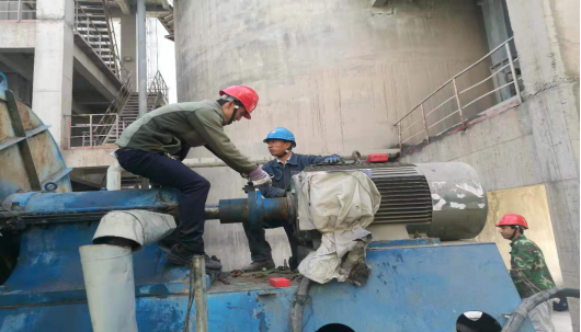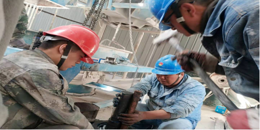 在其他設備檢維修現(xiàn)場,工人們依然具備這種“責任心”,如生料裝置接力風機維修現(xiàn)場,檢維修工人通過測振儀更換“主軸”。