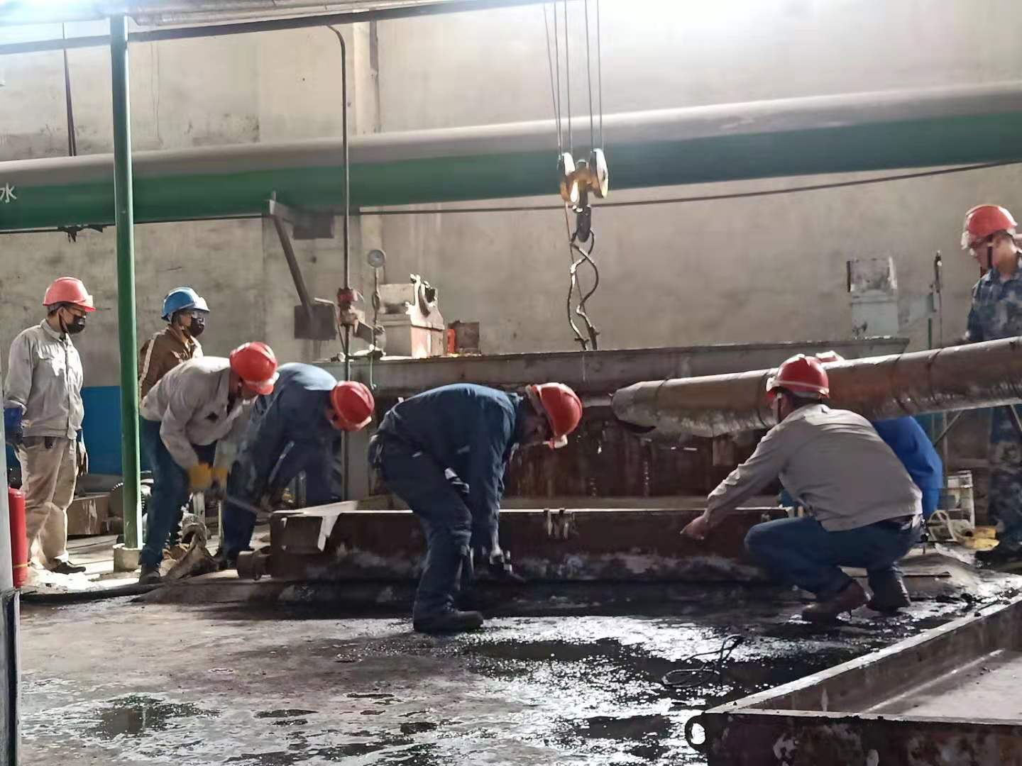 清晨,我看到兢兢業(yè)業(yè)的管理人員和朝氣蓬勃的年輕同事,他們“武裝上陣”頭戴安全帽,手帶防護手套。拿著各類方案和各類工具,快速地奔向各個檢修點。我看到他們忙碌的身影和為了完成檢修任務(wù)而焦灼的神情,大大小小的設(shè)備里三人一伙,兩人一組,有更換閥門的,有更換閥欄的,每個人手上、身上都沾滿了油污,他們沒有抱怨,只是默默地付出著。