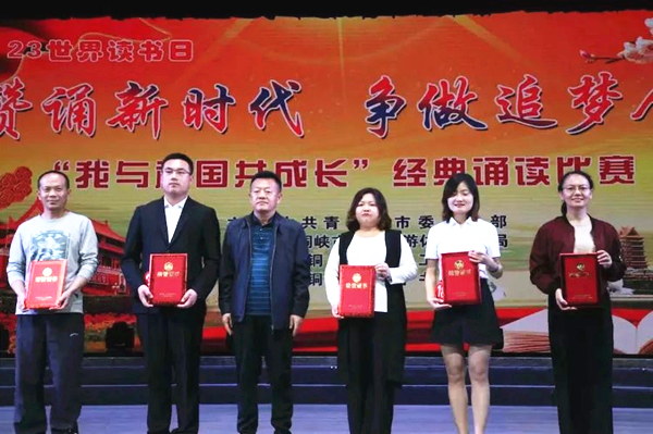 4月23日世界讀書日,由中共青銅峽市宣傳部、青銅峽市文化旅游體育廣播局、青銅峽市總工會(huì)聯(lián)合主辦,青銅峽市圖書館承辦的“贊頌新時(shí)代,爭(zhēng)做追夢(mèng)人——我與祖國(guó)共成長(zhǎng)”經(jīng)典誦讀比賽在青銅峽市影劇院隆重舉行。