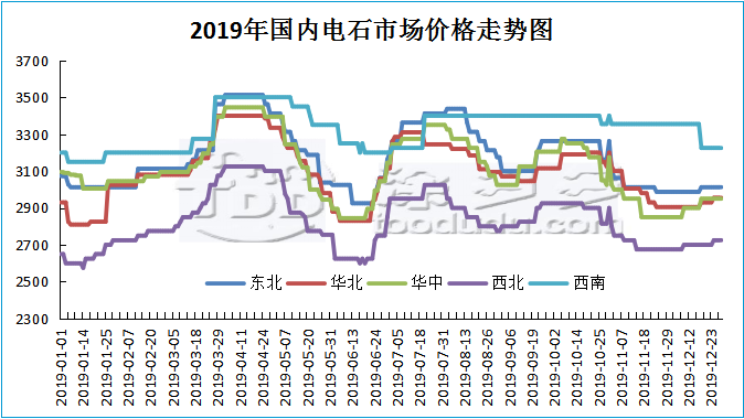 2019年中國(guó)國(guó)內(nèi)電石走勢(shì)上半年跟隨PVC走勢(shì)類似,第一季度震蕩上行整理,4月份到達(dá)年度高點(diǎn),但隨后價(jià)格開(kāi)始下行,下行至6月中旬又開(kāi)始震蕩上漲,隨后的三四季度震蕩走低中。整體來(lái)看作為PVC上游原料,電石的走勢(shì)類似于PVC走勢(shì),但并不完全相同,尤其下半年,我們可以推測(cè),下面的PVC收到資金以及市場(chǎng)炒作以及期貨方面的影響較大,并不是從供需、原料方面受到影響。
