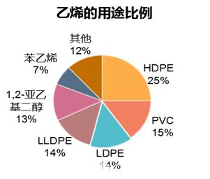 聚乙烯(簡稱“PE”)以及聚氯乙烯(簡稱“PVC”),都與乙烯有相當(dāng)密切的聯(lián)系。乙烯源于液化天然氣、液化石油氣、輕柴油、重油或原油等經(jīng)裂解產(chǎn)生的裂解氣中分出,亦可以從焦?fàn)t煤氣中產(chǎn)生,還可以從乙醇脫水中獲得。在全球聚乙烯制作方法中,其中44%為原油產(chǎn)出石腦油制乙烯,43%為天然氣產(chǎn)出乙烷氣制乙烯,13%為煤炭/天然氣產(chǎn)出甲醇制乙烯。在乙烯的所有用途中,PE和PVC對(duì)乙烯的使用量最大,分別占比53%和15%。