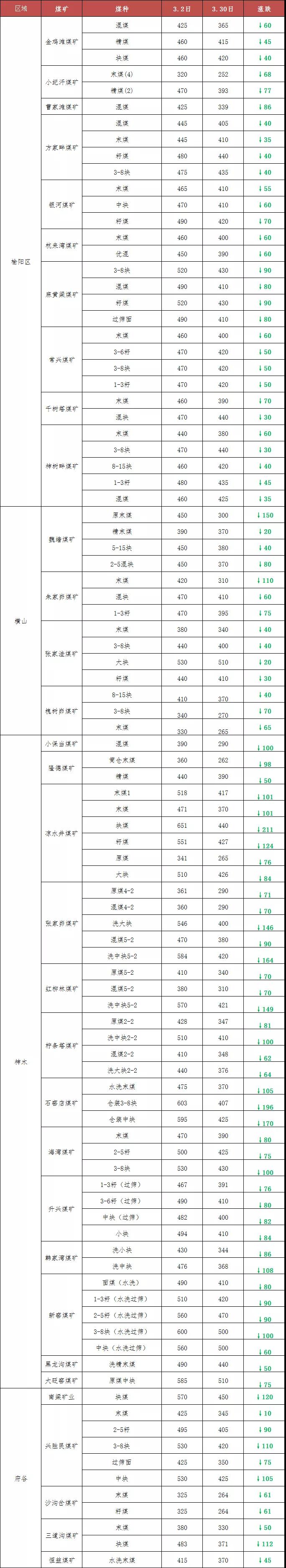 ▏倒工作面煤礦:創(chuàng)威煤礦、崔家溝煤礦、石巖溝煤礦 狼窩渠煤礦:接領(lǐng)導(dǎo)通知,3月30日、31日兩天綜采正常生產(chǎn)出煤,31日晚上井下停止開(kāi)始全面清掃井下衛(wèi)生。 近日,榆林煤價(jià)持續(xù)下跌,且有繼續(xù)下跌的可能。有客戶向榆林煤炭交易中心反映,最近下游終端用戶壓價(jià)幅度較狠,個(gè)別用戶壓價(jià)幅度達(dá)到90元/噸左右。 下游如此壓價(jià),這無(wú)疑是倒逼產(chǎn)地煤礦繼續(xù)降價(jià)。 據(jù)榆林煤炭交易中心了解,從3月初到現(xiàn)在,榆林許多煤礦降幅超100元/噸,個(gè)別煤礦降幅甚至快接近200元/噸。雖然煤價(jià)一直下跌,但據(jù)業(yè)內(nèi)人士分析,目前煤價(jià)還未探底,仍有幾十元的下降空間。