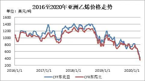 在需求增長和美國頁巖氣革命的推動下,近年來,全球乙烯行業(yè)進(jìn)入新一輪擴(kuò)能高峰期,供應(yīng)趨向?qū)捤,乙烯市場運行中樞下移。油價暴跌,乙烯的成本端支撐塌陷,乙烯市場加速下跌,乙烯法PVC的生產(chǎn)成本進(jìn)一步下降。截至2020年4月上旬,亞洲乙烯CFR東北亞報405至415美元/噸,較年初下跌逾40%。全球VCM市場供需相對平衡,價格波動幅度較小。2018年至2020年初,亞洲乙烯CFR東北亞價格大體在650-800美元/噸之間震蕩。受油價下跌影響,VCM價格大跌,2020年4月上旬,亞洲乙烯CFR東北亞報423-425美元/噸,較年初下跌近40%。