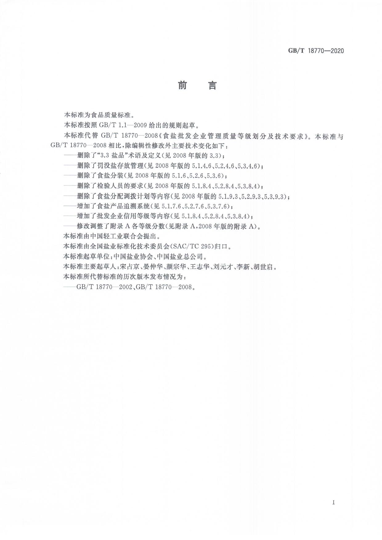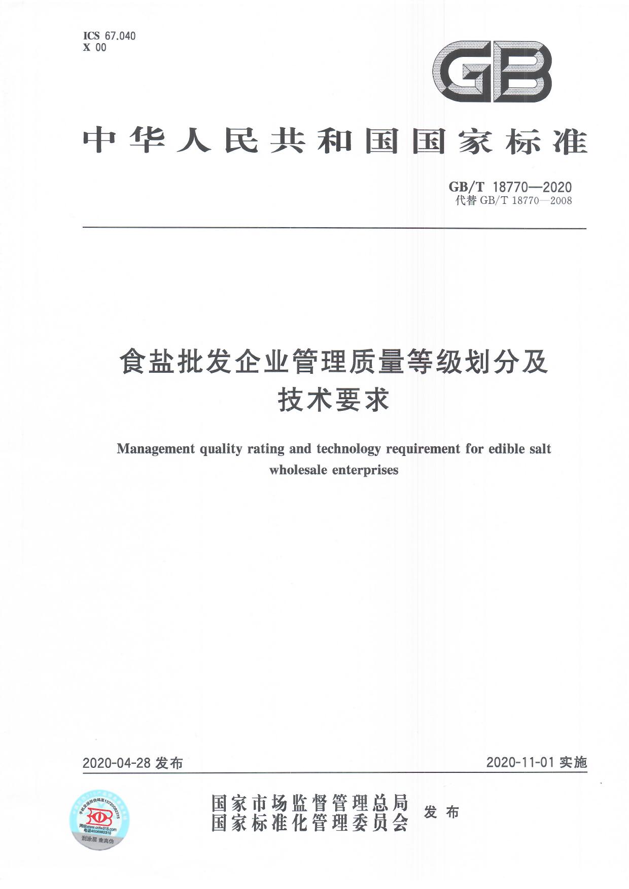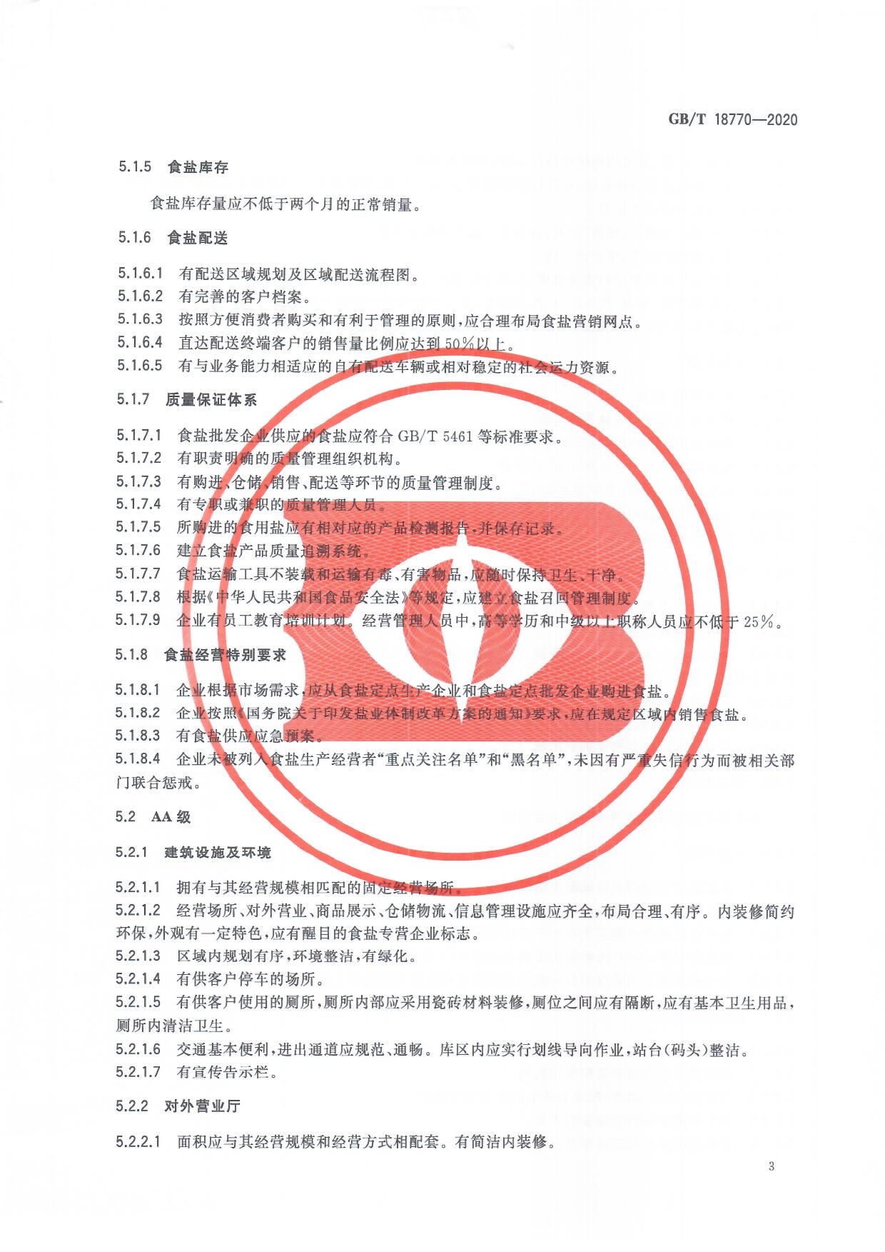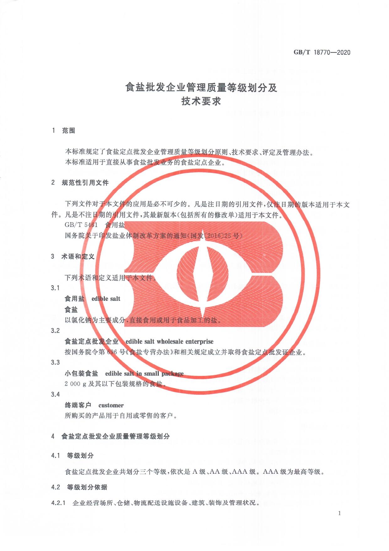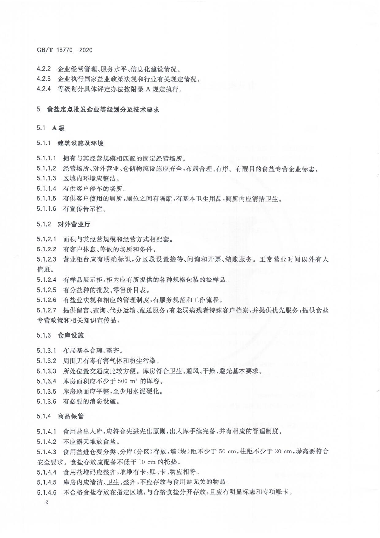 食鹽批發(fā)企業(yè)管理質(zhì)量等級(jí)劃分及技術(shù)要求(GB/T 18770-2020)