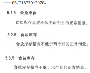 GB/T18770-2020標(biāo)準(zhǔn)提出A、AA級(jí)企業(yè)“應(yīng)不低于”二個(gè)月正常銷(xiāo)量?jī)?chǔ)備,AAA級(jí)企業(yè)“應(yīng)不低于”三個(gè)月正常銷(xiāo)量?jī)?chǔ)備,井礦鹽區(qū)生產(chǎn)精制鹽按市場(chǎng)需要產(chǎn)出,不象海湖鹽區(qū)產(chǎn)場(chǎng)集中生產(chǎn)堆垛,在目前市場(chǎng)競(jìng)爭(zhēng)條件下難以實(shí)現(xiàn),能夠達(dá)到一個(gè)月正常銷(xiāo)量食鹽儲(chǔ)備都很不錯(cuò)了。